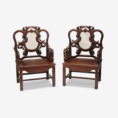 A pair of Chinese marble-inset hongmu armchairs 20th century