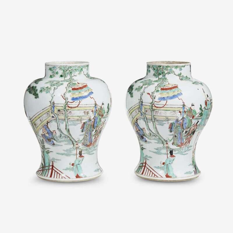 each baluster body rising from a foot to rounded shoulder and short neck, the exterior decorated with the scene of an aristocrat, with servants around him, meeting with a young man. (2).