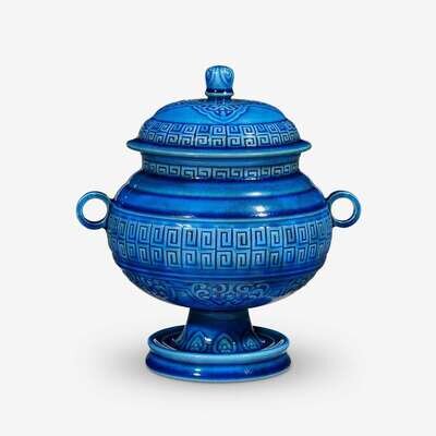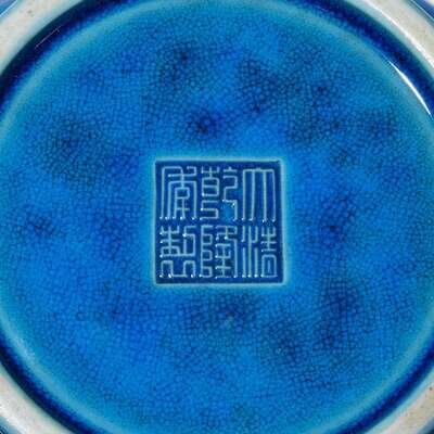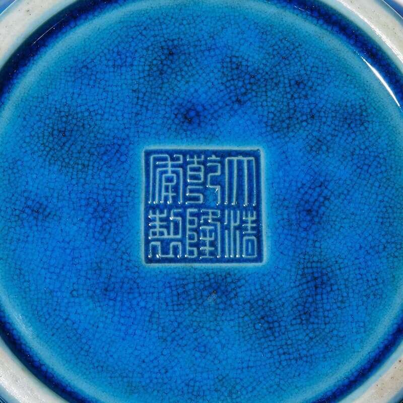 A Chinese blue glazed alter vessel and cover, dou carved qianlong six character seal mark and possibly of the period