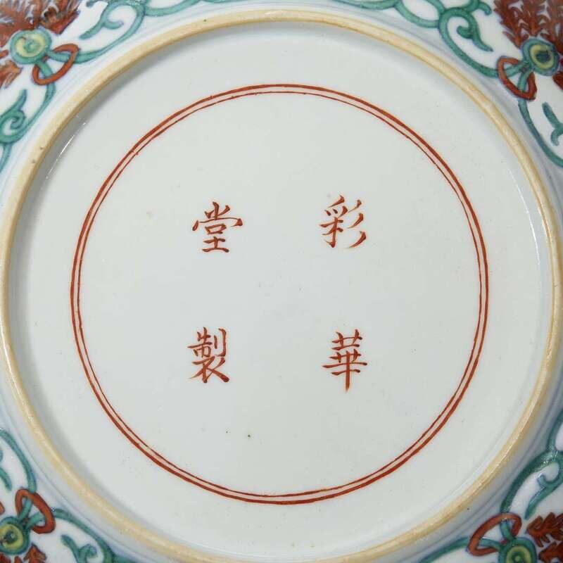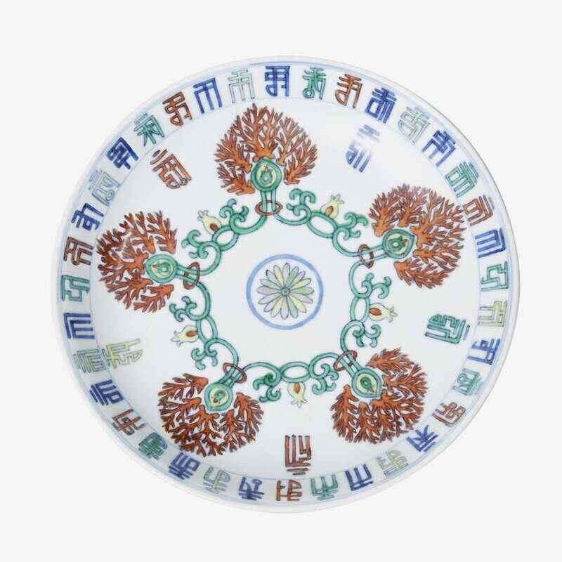 of circular form, decorated to the centre with a daisy surrounded by five chains with coral, decorated to the margin with Chinese auspicious symbols.