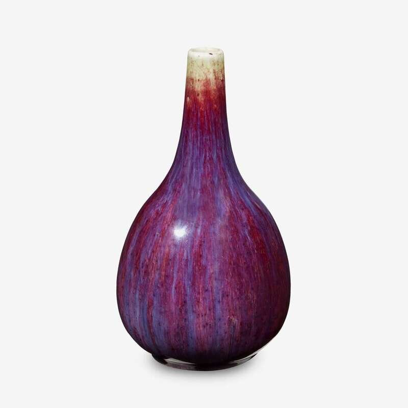 of elegant pear-shaped form, gently rising to a tall tubular neck, covered with a rich purplish-raspberry glaze, draining from the rim leaving a cream coloured band, suffused overall with a network of fine glaze crackles.