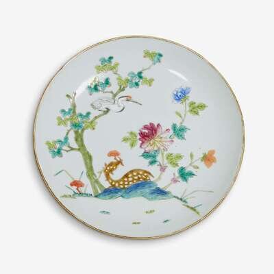 A Chinese famille rose 'deer and crane' plate iron red peach mark, daoguang period