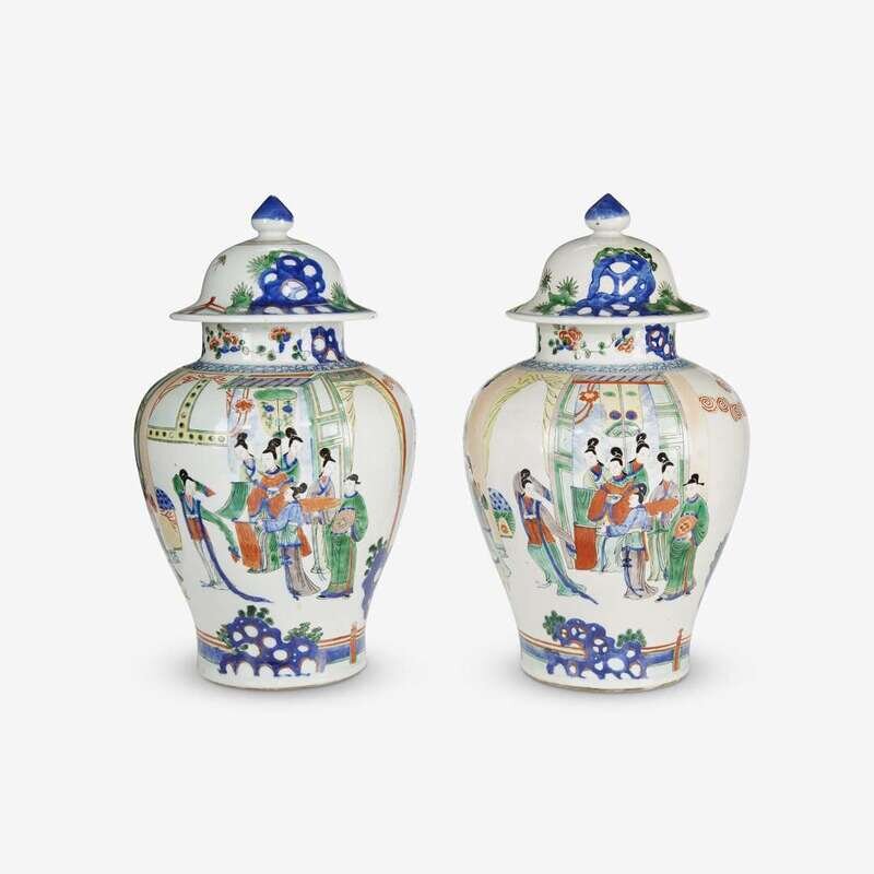 A pair of Chinese wucai baluster jars and covers 19th century or earlier