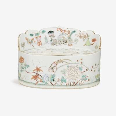 of oval form with straight walls and a partially covered interior, decorated in famille rose enamels to show birds, flowers and precious objects, carved and painted to back with swirling blue cloud.