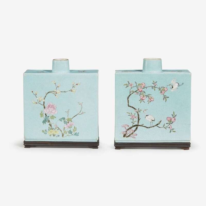 each of rectangular form with a short cylinderical neck, the exterior decorated with elegant flowers on a podwer blue ground. (2).