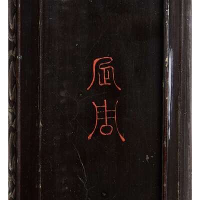 deeply carved in 'pommel scroll' pattern through layers of black and red lacquer, black lacquered interior marked with 'wu zhou' inscription.