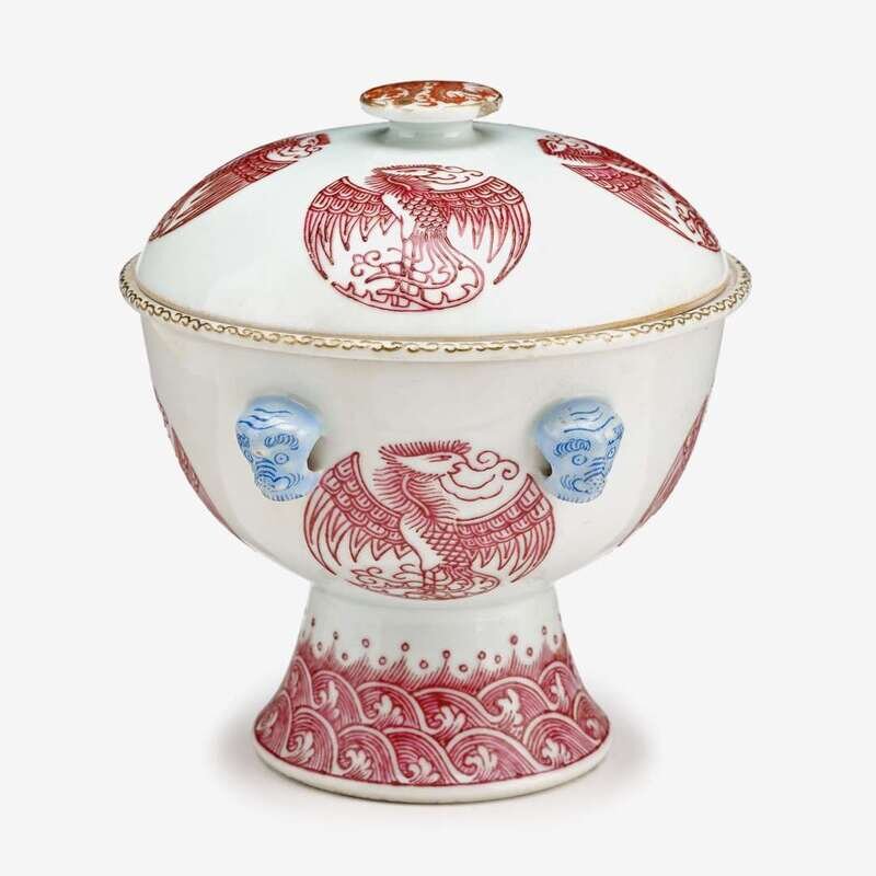 A rare Chinese puce enameled porcelain 'phoenix medallion' warming bowl with stem guangxu six character mark and of the period