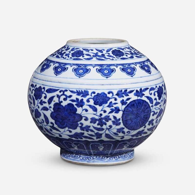 the globular body rising from a short foot, painted with a composite flower scroll band and lotus-lappet, the base inscribed with a six-character mark.