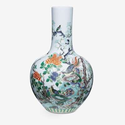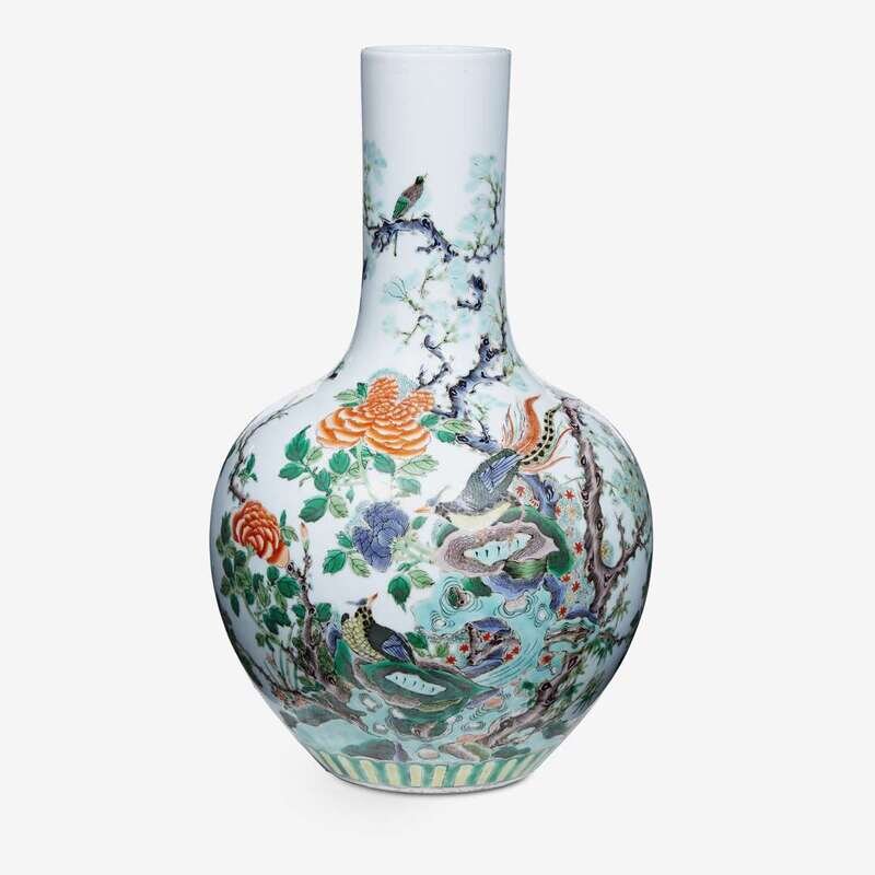 the body of ovoid form and with straight cylindrical neck, decorated to show birds among rockwork and blooming flowers.