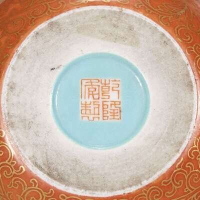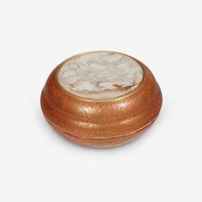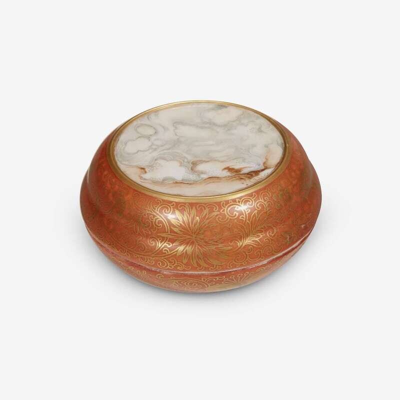 gilt lotus decoration over an orange ground, the top panel painted in faux marble pattern.