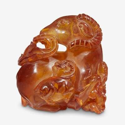A Chinese amber carving of three rams qing dynasty