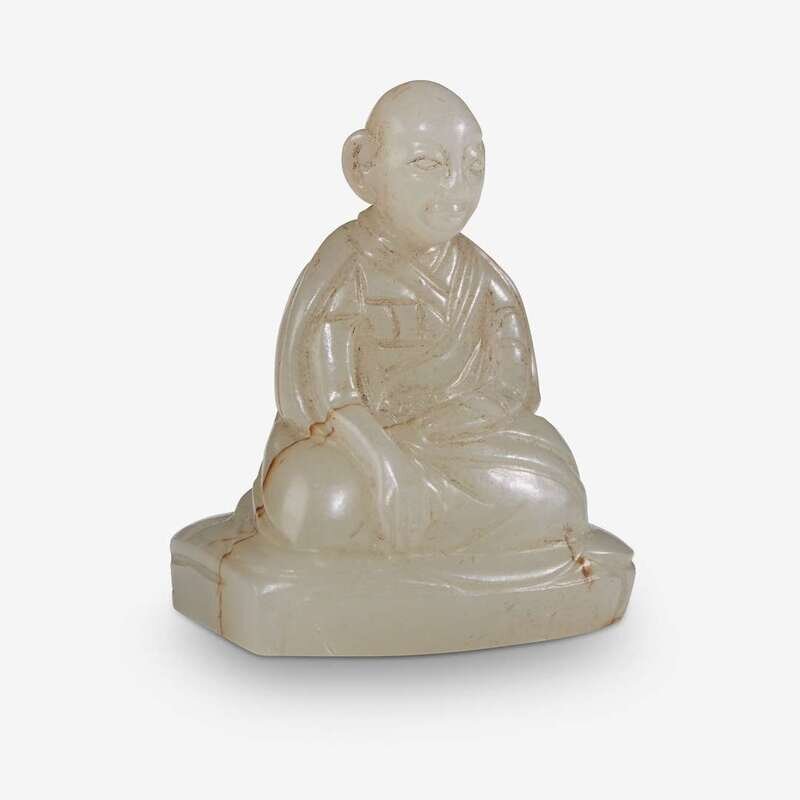 depicting the Panchen Lama in a cassock sitting on a futon, the stone of a celadon-white color.