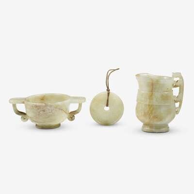 comprising a small white jade twin handle incense burner, a small white jade 'chilong' handled wine vessel and a small archaistic 'bi' disc. (3).