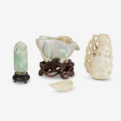 comprising a small 'mutton fat' jade 'dragon' bottle vase, a jadeite 'lotus' brush washer, a small jadeite archaic cylindrical vase and cover and a hardstone 'cicada' pendant. (4).