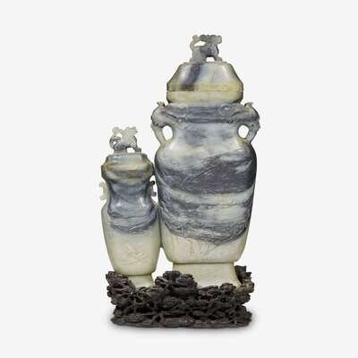 A Chinese grey and white jade double vase with covers 19th/20th century