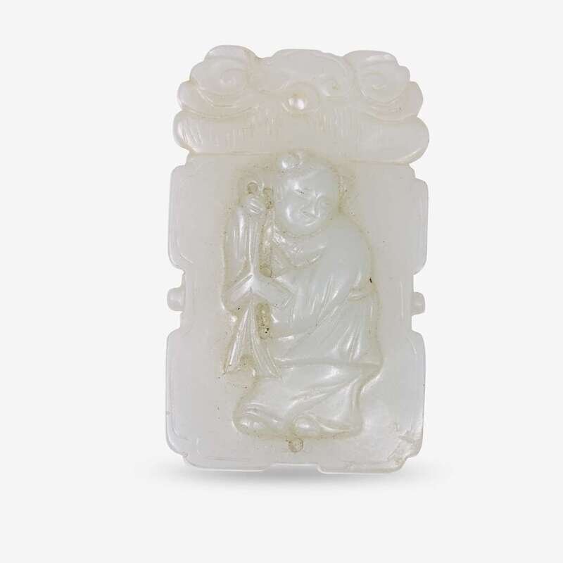 of rounded rectangular form, carved on one side with a figure, the reverse carved with the 'double-happiness' character, shuang xi.