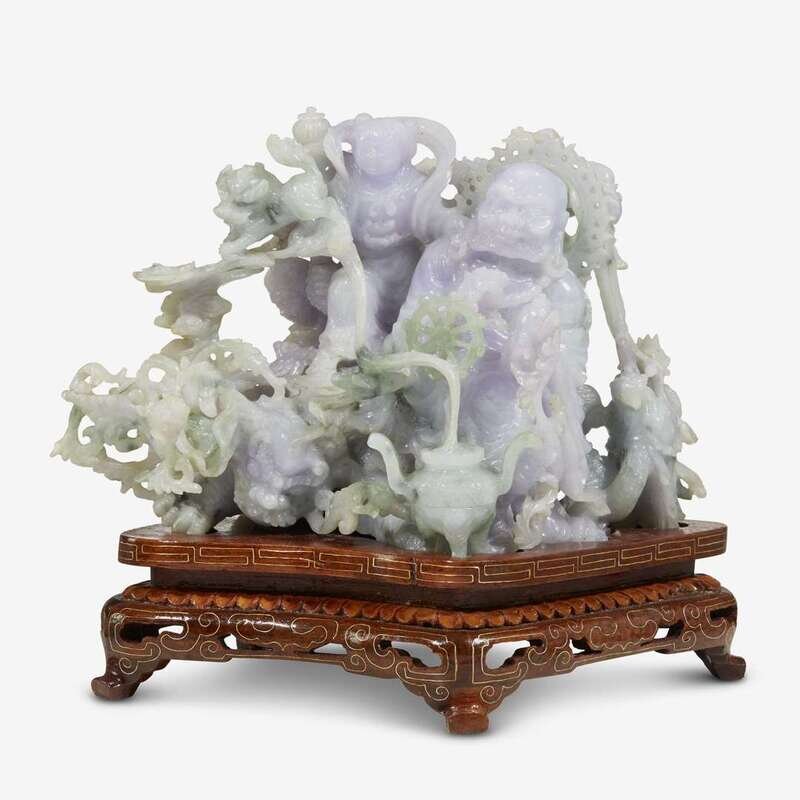 A Chinese green and purple jadeite grouping of buddhistic figures 20th century
