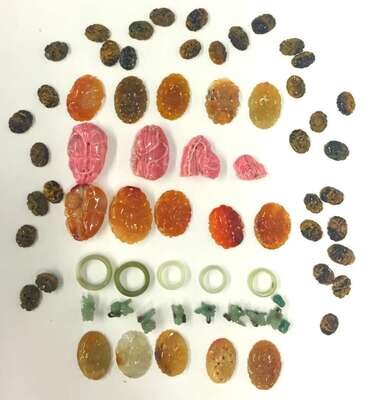 A collection of sixty-seven Chinese agate, jade, tiger eye, rose quartz and serpentine elements 20th century