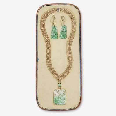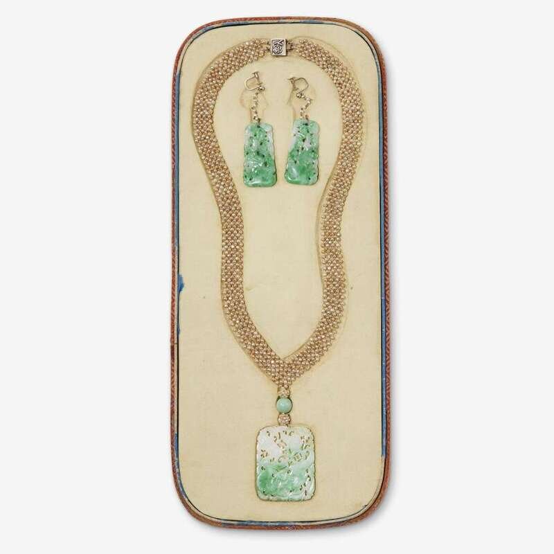 A Chinese seed pearl and jadeite necklace and earring set late qing/early republic period