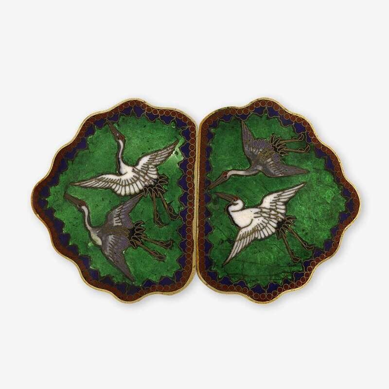 the two shield-form halves with undulating edges decorated in colored enamels against a green ginbari ground to show cranes in flight.