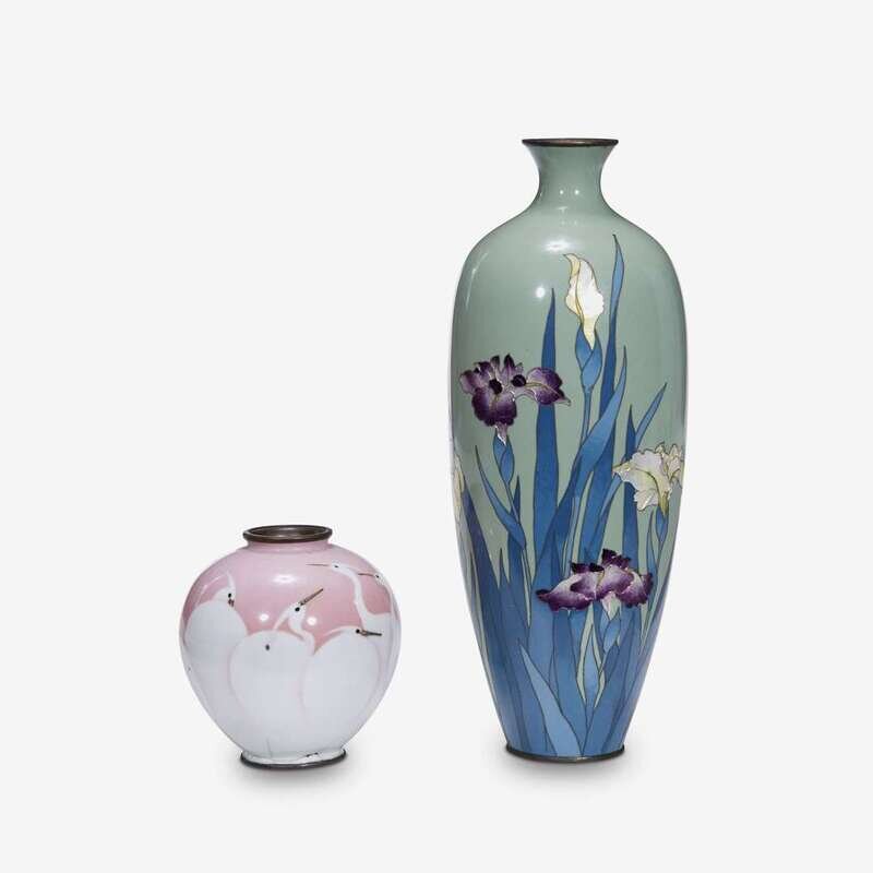 of high-shouldered, tapering form, decorated to show lustrous foil-backed iris blossoms and leaves over a light green ground, together with a pink ground jar depicting snowy herons, Meiji period. (2).