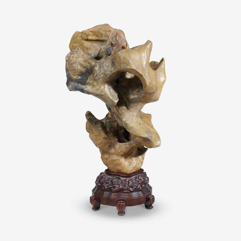 of a soft yellow color, the stone with hollows representing characteristic feelings of elegant composition and pleasing proportions; with fine fitted hardwood stand.