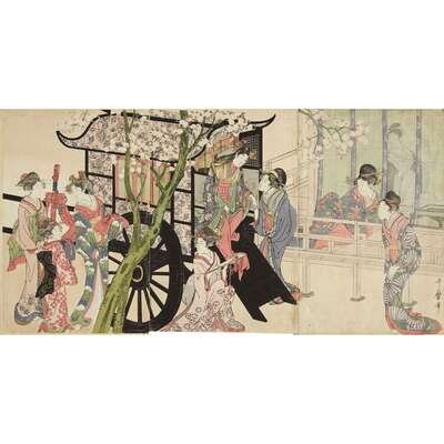 color woodblock print, oban triptych sight H: 14 1/2 in, 37 cm; W: 29 in., 74 cm