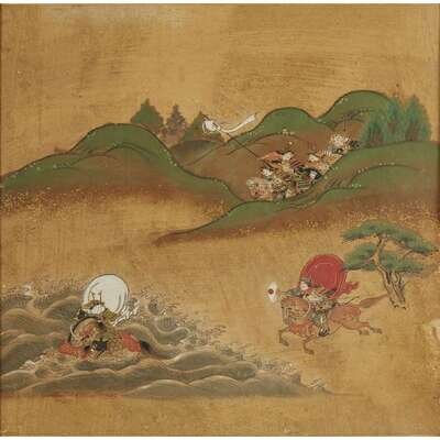 two paintings of samurai scenes; ink, color and gilding on paper, mounted and framed; signed by the artist (2) H of each: 13 1/2 in., 34 cm ; W: 14 in., 36 cm