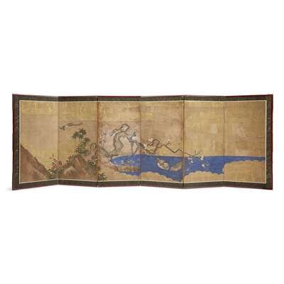 six-panel folding screen; ink and color on paper mounted on wooden panel H: 39 1/2 in., 100 cm ; W: 112 in., 286 cm