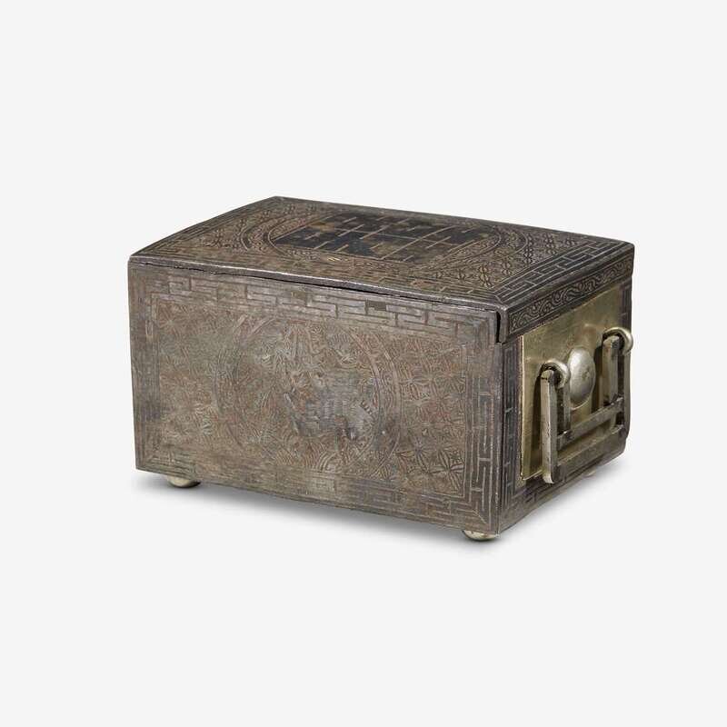of rectangular form, decorated with inset silver to show animals and a double character within circular reserves over a diaper ground; with false drawer and sliding top activated by hidden mechanism.