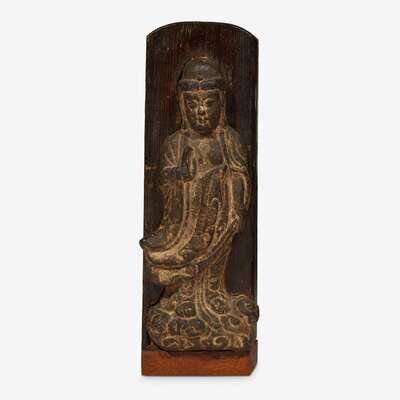 the figure standing barefoot on a cloud shaped pedestal, her face with carved features set in a meditative expression, mounted on a wood back panel.