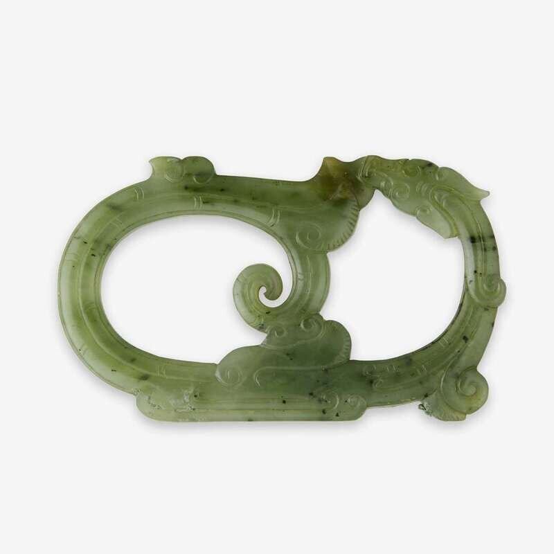 in the form of a archaistic kuiling, the stone of a rich green colour mottled with white and black specks.
