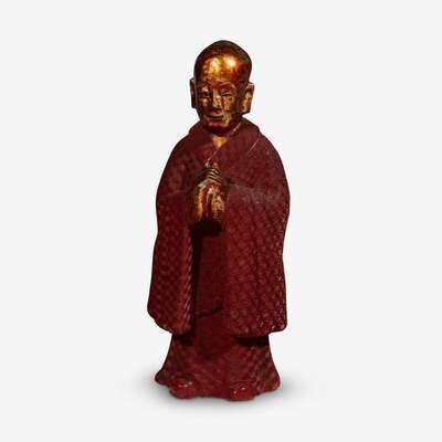 a standing monk with hands folded, golden body and head with a cinnabar cassock, the face with benign expression.