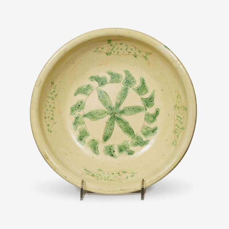 A large Chinese yellow and green glazed 'fish' dish liao dynasty