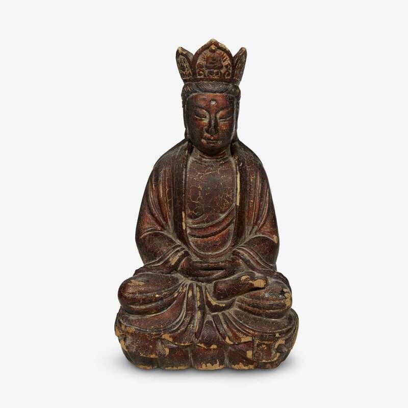 of large proportion and with majority of lacquer extant, the crowned and robed figure seated in dhyanasana displays dhyana mudra.