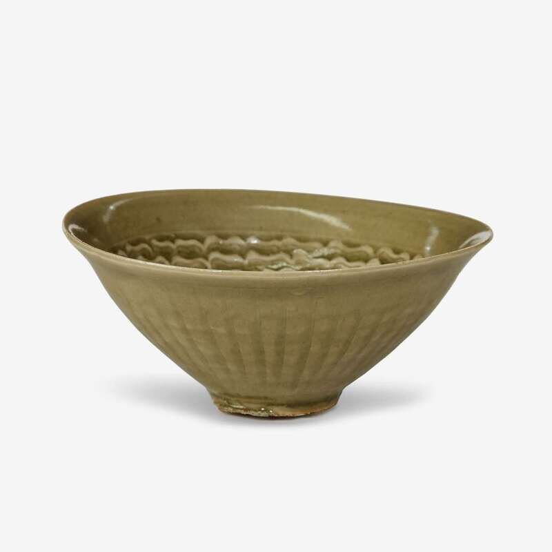 the thinly potted conical sides rising from a short ring foot to a flared rim, molded on the interior with four fish amid waves, the exterior carved with radiating flutes, applied overall with a celadon-green glaze.