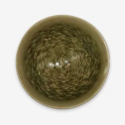 A small Chinese moulded 'yaozhou' celadon glazed 'four fishes' bowl northern song dynasty