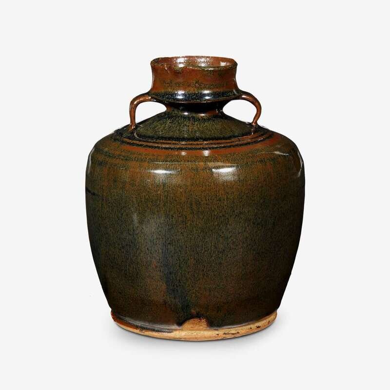 ovoid body with a pair of small handles on the neck, applied overall with brown and iron-red glaze.