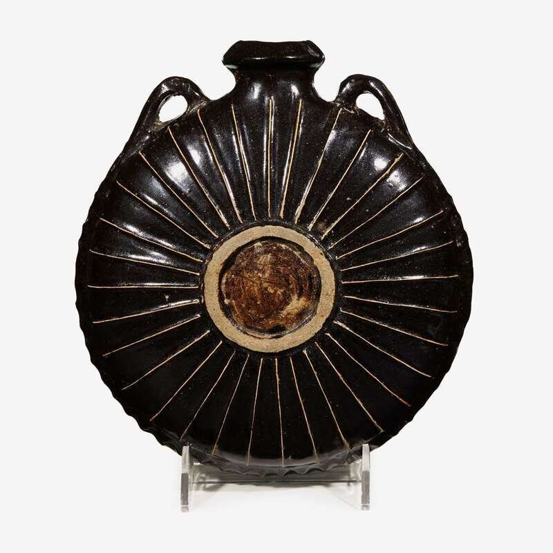 A Chinese 'cizhou' ribbed black glazed pilgrim flask jin dynasty