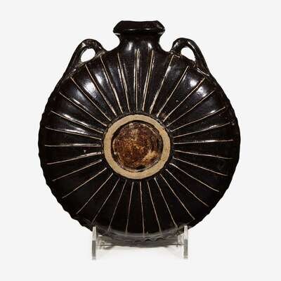 moon shape body with two handles on the shoulder, covered overall in a black glaze and golden lines emanating from center.