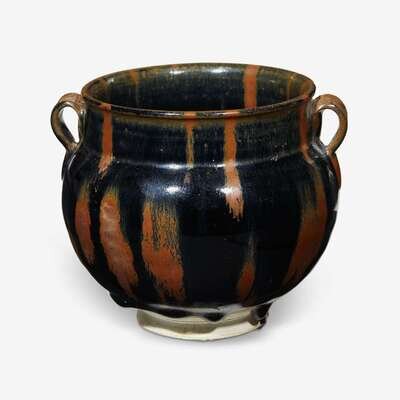 of globular form with a pair of small strap handles on neck, covered by black and iron-red glazes.