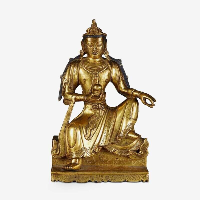 the figure posed in royal ease on a stepped rectangular base and holding a bottle vase and pearl, the crowned head with long hair parted into tails bears a serene expression.