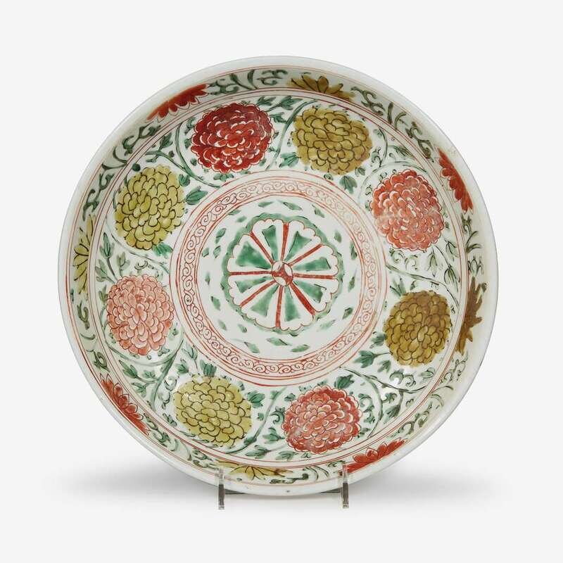 rounded sides resting on a short foot, the interior decorated in a wucai palette with eight flowers on a white ground, the exterior decorated with four flowers around the plate.