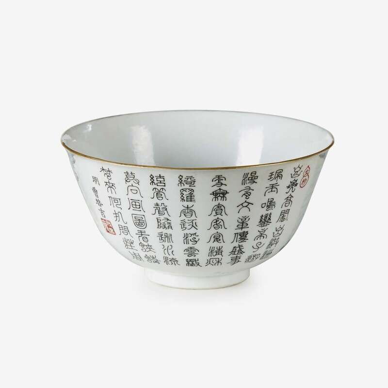 the deep rounded sides supported on a tapered foot, the exterior decorated with the landscape of Tengwang Pavilion by the river and a poetry by Zeng Qiji, the poet of Ming Dynasty.