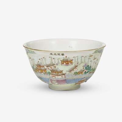 A Chinese famille rose 'landscape' bowl jia qing iron red four character seal mark and of the period