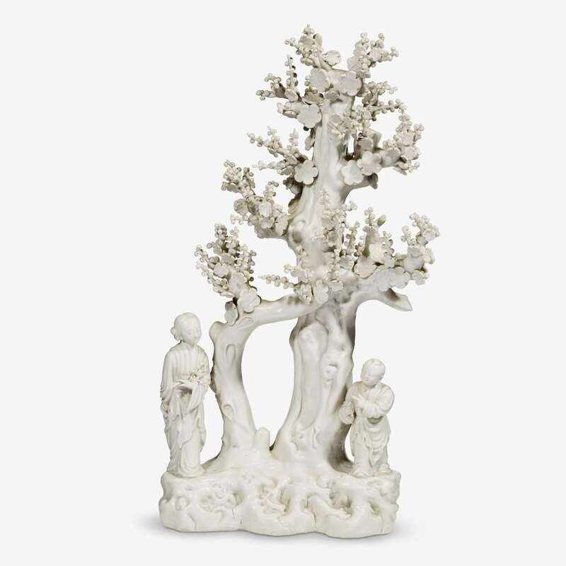 A Chinese dehua porcelain prunus trees with figures of lady and attendant 19th century
