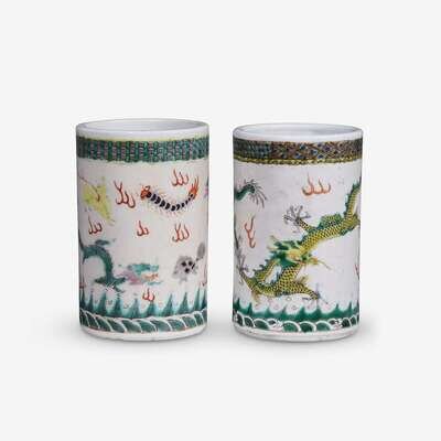 A matching pair of Chinese famille verte 'dragon' brush pots qing dynasty