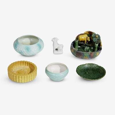 comprising of a yellow glazed 'fish and bamboo' brush washer, a turquoise glazed brush washer, a small turquoise glazed 'lotus leaf' washer and two glazed earthenware vessels. (6).