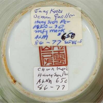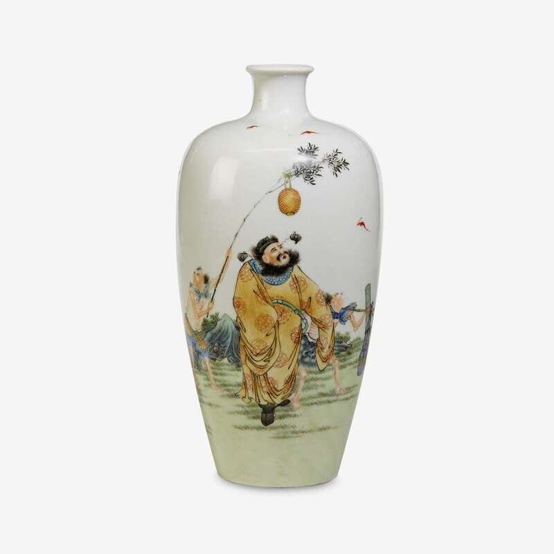 the ovoid body rising to a rounded shoulder, and narrow short waisted neck with everted dished mouth, finely fencai enamelled around the exterior with the Zhongkui shown stood in the middle accompanied by two demons, one with a pole over his shoulder suspending a purple wine jar and a rolled mat, the other carrying a bamboo and lantern.