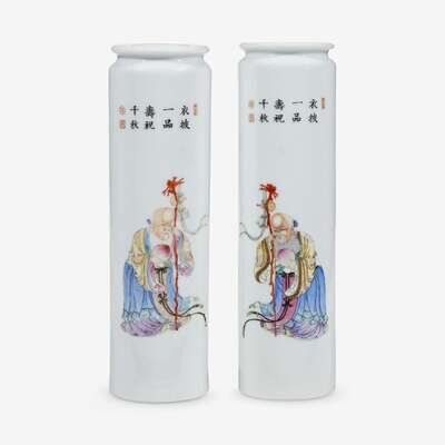 each of cylindrical form with a short neck, each decorated with the image of 'Shou lao', an immortal of China, and a hundred Chinese character 'shou'.